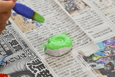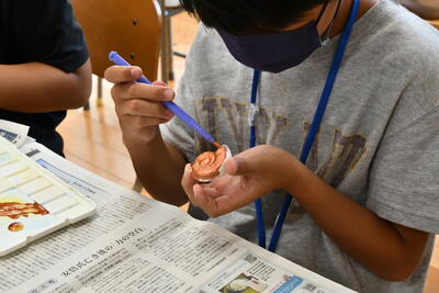 クイズをやっている間に固まった石こうアンモナイトにそれぞれ好きな色をつけて持ち帰りました。