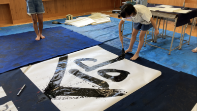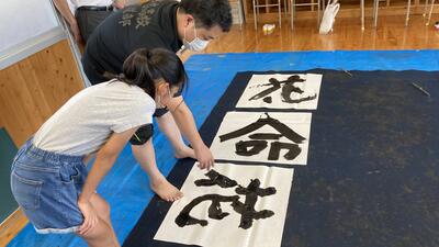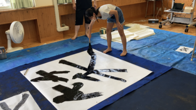 書道の様子です。書道パフォーマンスを実施しました。1.5m四方の用紙に大きな筆で迫力のある字を書いていました。
