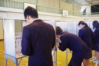 先生方3人がそれぞれ公約を掲げ、熱い選挙演説を行い、実際の投票用紙や投票箱を使い、投票を行います。