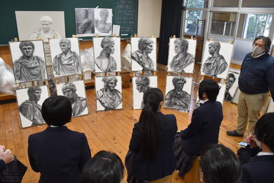 2年生に石膏像木炭デッサンの講評を行いました。授業時間に加えて、朝や昼休み等の空き時間を見つけ、理想のデッサンに近づけるため頑張っていました。4月からは美工では多くの生徒が美術系大学を目指す受験生になります。この調子で頑張っていきましょう!!