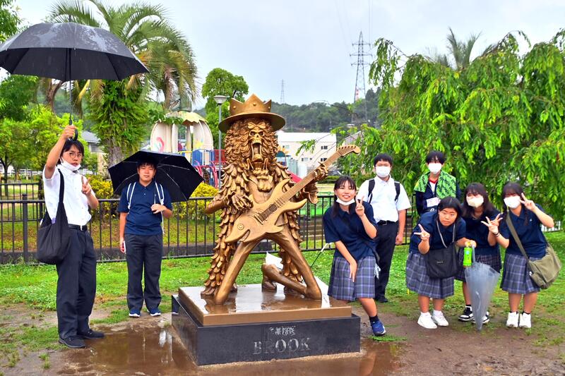 小雨が降ったりやんだりの天気でしたが、近くの恐竜公園まで歩いて行き、恐竜やブルック像と記念写真を撮りました。