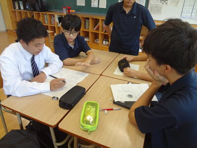 グループのメンバーと話し合い、一つの答えを出します。重ならないように慎重に!!時間ギリギリまで考え競い合いました。重ならないって案外難しいですね。