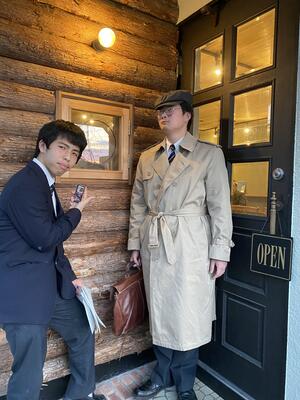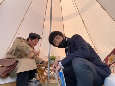 のあそびlaboの中村さん、のあそびlodgeの山本さんにお話を伺いました。取材の様子と屋上で夕焼けをバックに記念撮影をさせていただきました。