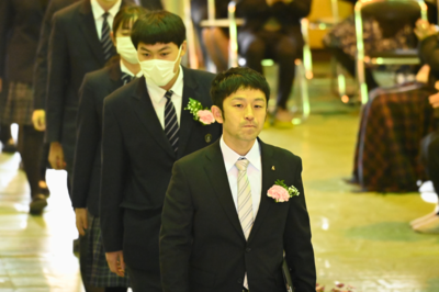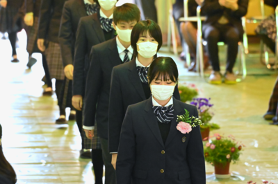 前日に家庭部が手作りしたコサージュを胸に、卒業生が堂々と入場。