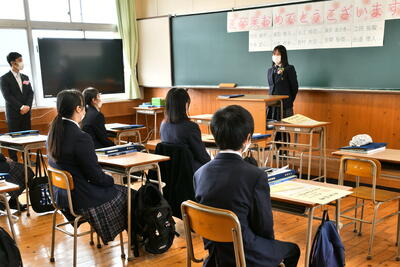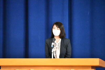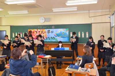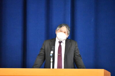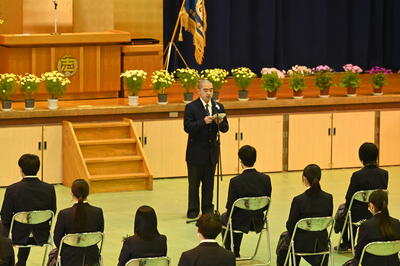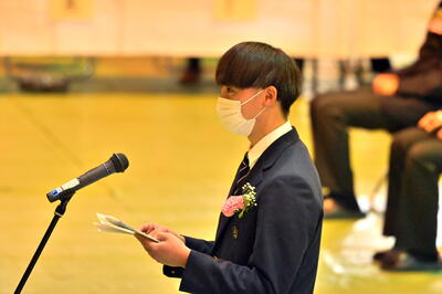 新型コロナウイルス対策のため在校生が参加出来ない中で、生徒会長が在校生代表として立派に送辞を述べました。
