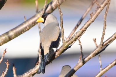 不思議なさえずりがすると思ったら「イカル」という鳥が10羽ほどの集団で来てました