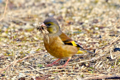 「カワラヒワ」も巣作りでしょうか。枯草をせっせと運んでいました