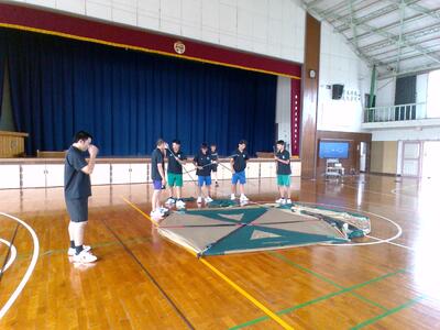 本日のスポーツ・体育コースの授業である専攻体育では7月5.6.7日にあるキャンプ実習に向けての授業を開始しました。例年キャンプ実習でYMCAさんから多くのことを学んできましたが、今年度からは実習前にテント立て方などを学び、さらにレベルアップした実習にしようと取り組んでいます。本日の授業では2年生が考えてきたキャンプ実習の献立を全体で共有した後、実際にテントを組み立てました。みんなで声掛け合い協力して立てることができました。来週の専攻体育は火曜金曜ともキャンプ授業になるので実習に向けての準備をしていきたいと思います。