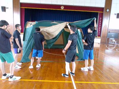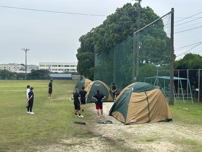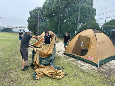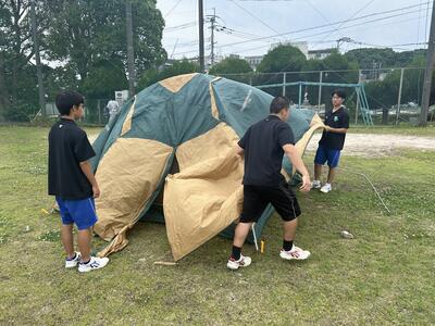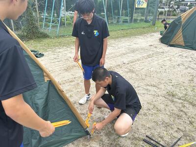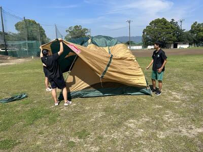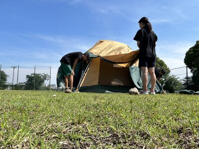 ロープワークのあとは、テント設営をグラウンドの方で行いました。