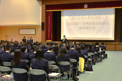 「暮らしたいまち日本一」岱志高校・有明高校合同事業成果発表会が有明高校体育館で行われました。当日は、荒尾市長をはじめ多くの関係者が出席される中、有明高校とともに2学年の代表班が、今年度の取組について報告を行いました。