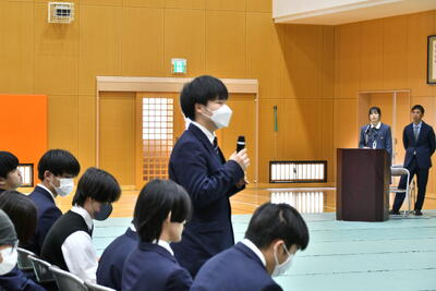 質疑応答では、「どのように進路を決めたのか」「緊張をどのように克服したのか」といった在校生の質問にも具体的に答えてくれました。早い時期から進路を意識し、毎日コツコツと努力を積み重ねることで自信につながることの大切さを伝えてくれました。