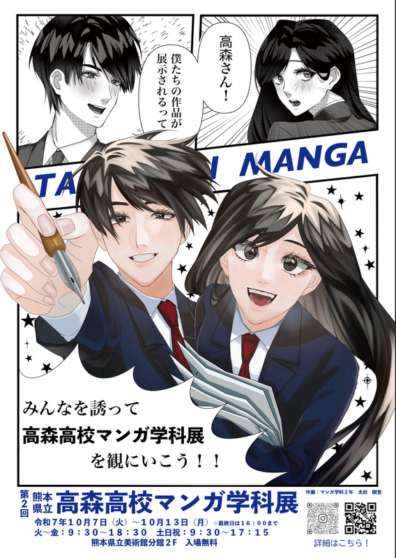 第2回高森高校マンガ学科展を熊本県立美術館分館2Fで開催します!会期は10月7日(火)~13日(月)まで。1,2年生のマンガ、イラスト作品を展示します。たくさんのご来場をお待ちしております!!