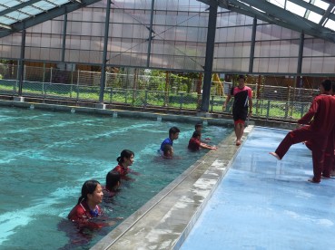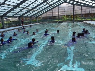 これから暑い季節となるので、水難事故を防止することを目的として毎年取り組んでいます。体育服のままプールに入り、水の抵抗を実感したり身近なものが浮き輪代わりになることを体験することができたようです。