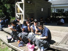 ゴール後は、保護者の方々に用意していただいた豚汁とおにぎりを食べ、走った感想などを話しながらチャレンジ大会をテーマにした短歌を書いていました。