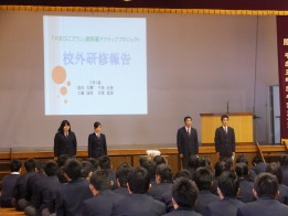 その後、生徒の学習成果発表では1年生の総合的な学習の時間での取り組み内容について、2年生の1インターンシップ活動報告がありました。