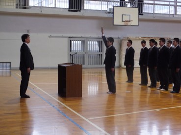 陸上競技部顧問から選手の紹介がありました。後校長先生から「1つの襷にチームの思いを込め、それぞれの目標タイムクリアのため精一杯頑張ってください。」と激励の言葉を受け、「仲間とともに襷をつなぎ、全力で駆け抜けます」と選手代表が宣誓しました。