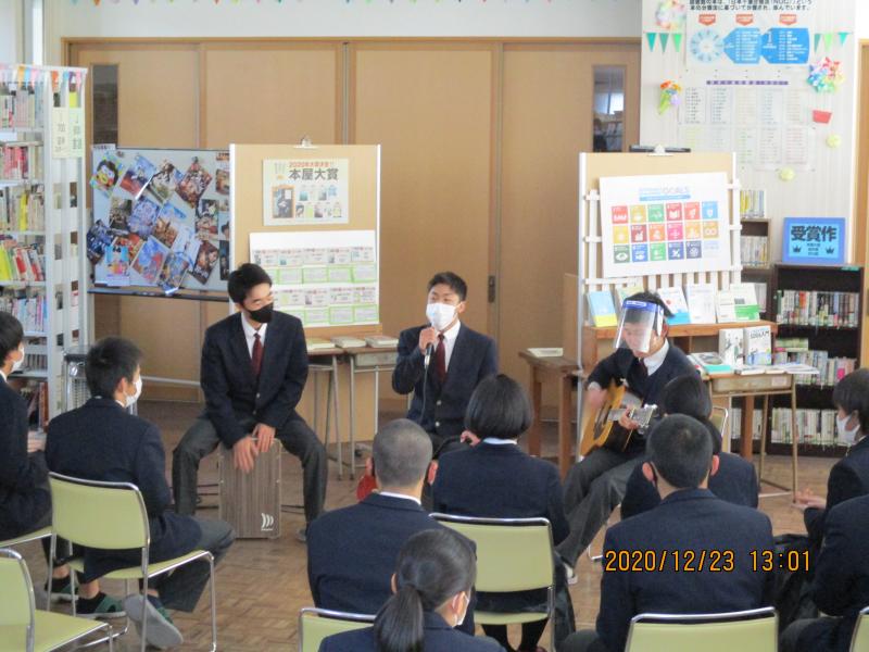 12月23日(水)、ランチタイムコンサート@図書館が行われました。このコンサートのために、アコースティックにアレンジした曲は3曲。「あなたに(MONGOL800)」「いつかのメリークリスマス(B'z)」「Whereever You are(one OK rock)」を披露してくれました。 たくさんの生徒が、広い図書館の思い思いの場所で、3人の演奏に聴き入りました。図書委員たちも、「とてもよかった!」という感想を口にしていました。