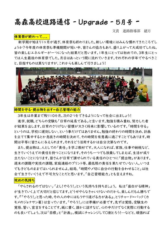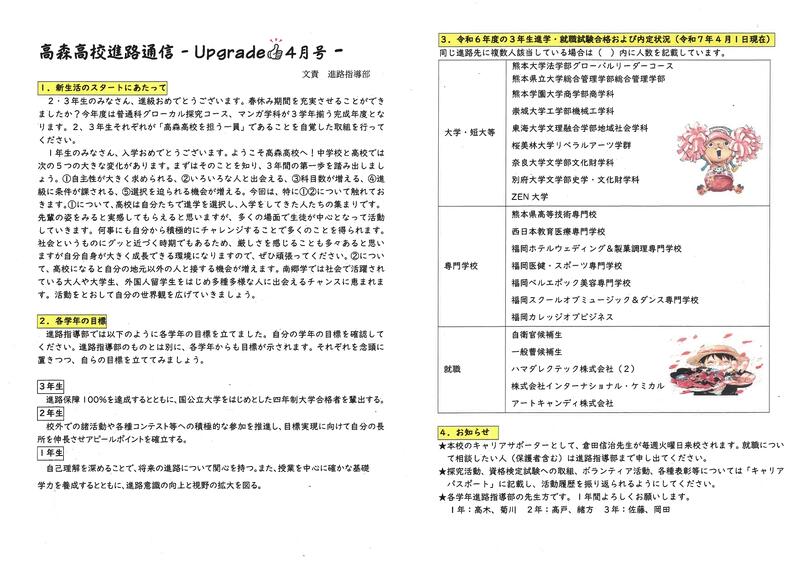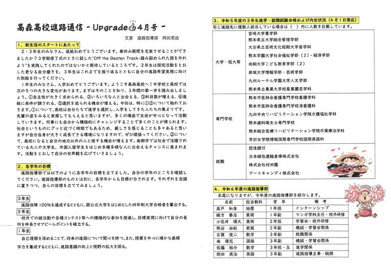進路通信(4月号) 投稿日時 : 2024/04/09 学校サイト管理者 R6年度の進路通信(4月号)を掲載いたします。 ぜひ御覧ください!画像をクリックすると拡大表示されます。 0 {{options.likeCount}} {{options.likeCount}} {{options.unlikeCount}} {{options.unlikeCount}}