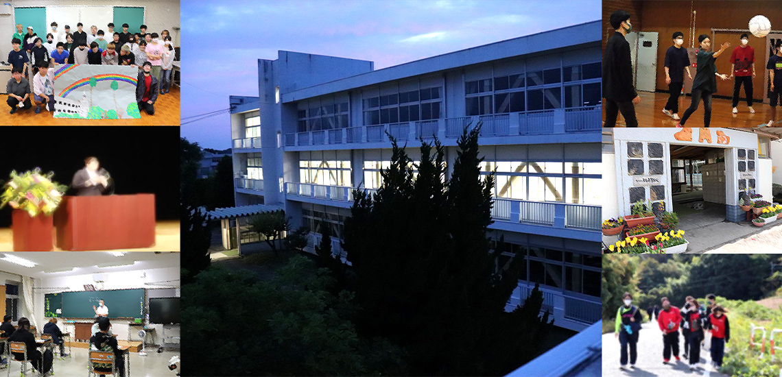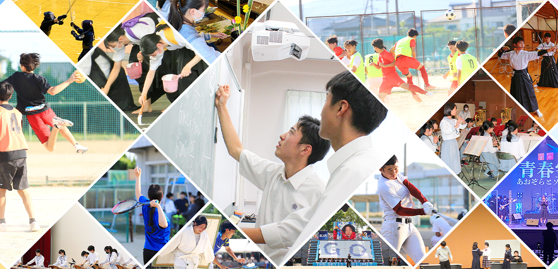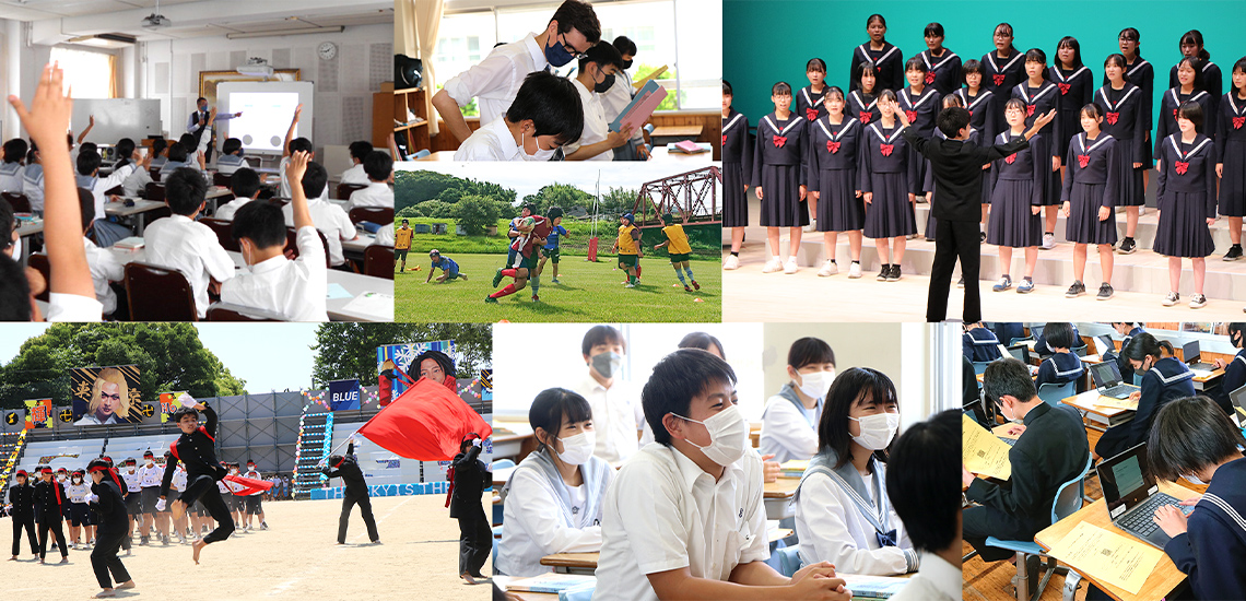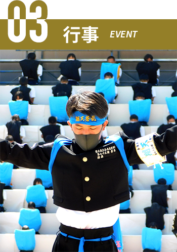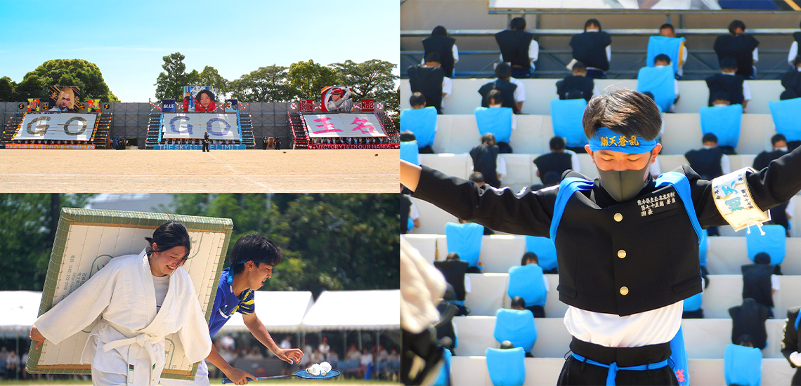 - 本校の行事には、「人文字」が全国的に有名な体育祭があります。企画から実施までを生徒が主体となって行い、その時々のメッセージを、5色の布で表現します。当日は5千人を超える観客が訪れ、生徒が作り上げる人文字に魅了されています。また、本校の文化祭「若駒祭」は、全定中が一体となり、同窓会や保護者会も参加し、とても盛り上がる2日間のイベントです。