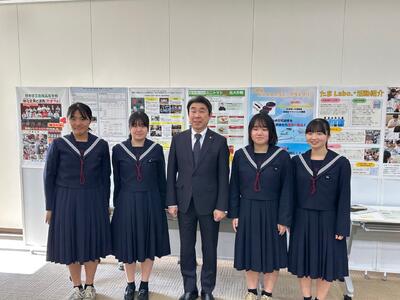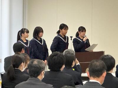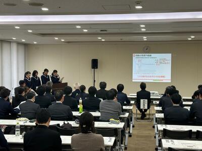 12月14日(土)に玉名市役所において、「玉名市内高校大学研究等合同発表会(未来トーク)」が開催されました。本発表会は玉名市内の高等学校や大学が集まり、総合的な探究の時間を通じた成果報告や研究発表を行う場として昨年度より実施されており、更なる研究や活動の充実・発展を目指しています。本校からも玉名高校と熊本大学、玉名市が連携して行っている講義を受講している4名の生徒が発表会に参加し、「地方創生と自分のキャリア」について発表を行いました。発表後は藏原隆浩玉名市長をはじめ、経済産業省貿易経済協力局長などを歴任し、現在は一般社団法人オープンガバナンスネットワーク代表理事を務める奥村裕一様など各方面の方々から温かいコメントや講評をいただきました、また、他校の生徒による発表を聞くことで、視野を広げ、今後のキャリア形成について深く考える貴重な機会となりました。