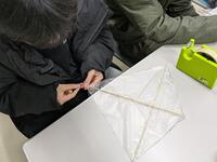 12月10日は凧作りに挑戦しました。凧上げの経験のない者もいましたが、竹ひごとビニールで小型の凧を作り、安定感を増すためのしっぽを取り付けました。完成した凧は、天候の関係で体育館で上げました。風がない中で凧のバランスを保つことが難しく、思うように上がっていかずに苦戦しました。今度は野外で挑戦したいです。