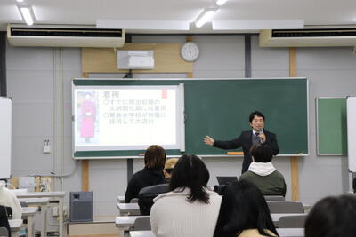 7月16日(水)3・4時限に職業講話を実施しました。「社会人と学生の違い~就業って?ライフプランって?を考えよう~」と題し、講師として、オートアライアンスホールディングス株式会社管理本部総務課 課長代理 下田智輝 様をお招きしました。講話を聞いて、何のために働くのか、何を目的に働くのかを考える機会になりました。また、日本一の総務を目指して生きている下田様の「職業観」が心に響きました。生徒たちは、何か一つでも夢や目標を持ち、前進し続けようという気持ちを強くしました。下田様、ありがとうございました。