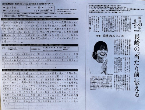 日本新聞協会が8日に「第16回いっしょに読もう!新聞コンクール」の全国審査結果を発表しました。本校からは、夏休みのサマーペガサスでの副校長のNIEの講座を受講したメンバーが応募していました。その結果、2年生の藤木さんが「熊本県賞」56点の1点に選ばれました!おめでとうございます!藤木さんは長濱ねるさんの「戦後80年昭和百年 被爆を語る」の記事を選んで、感想や意見を書きました。