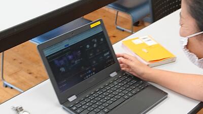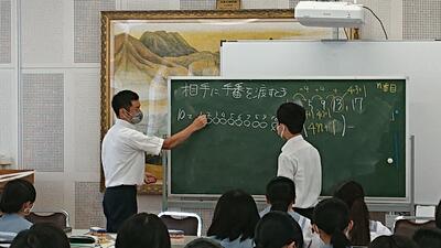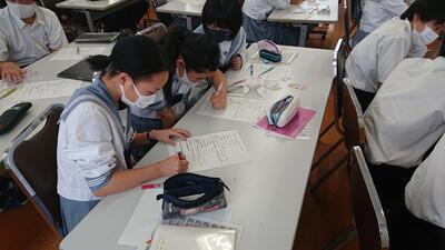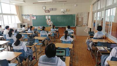生徒は、それぞれ自分の端末や家庭の端末を使い、授業に参加していました。