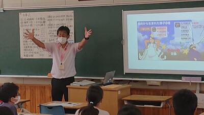 こちらは『古事記』を題材とした授業。参観した小学生や保護者の方々も神話の世界に引き込まれている様子です。
