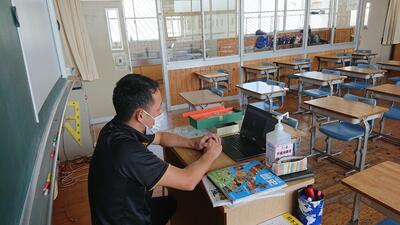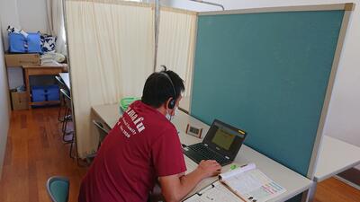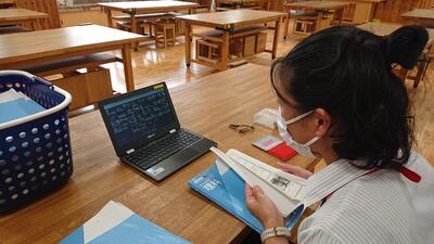 生徒のいない教室や準備室などから、担当の先生方がリモート授業に合わせた教材を準備し、授業が行われました。