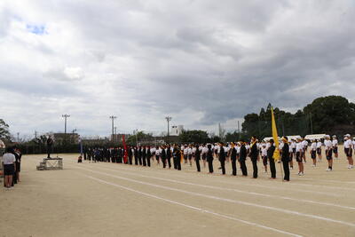 生徒会長の谷口君のあいさつに続いて、青団の団長の菊川さん、赤団の団長の成瀬くん、黄団の団長の安岡さんの3人による選手宣誓が力強く行われました。
