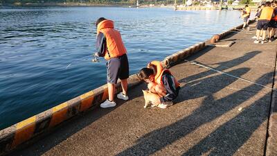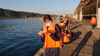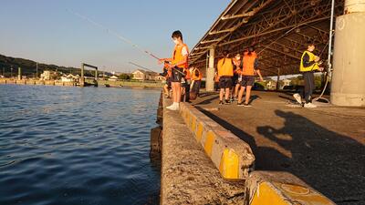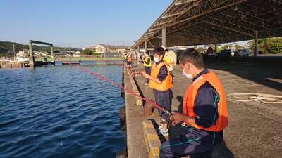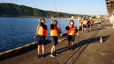 魚釣りには30人が参加しました。火山の噴火口跡にできた山川港での活動です。