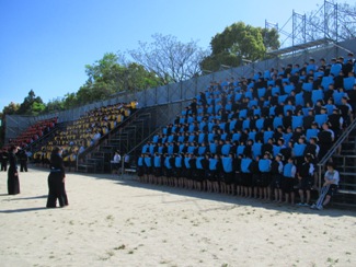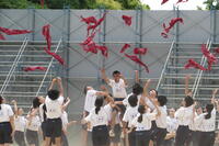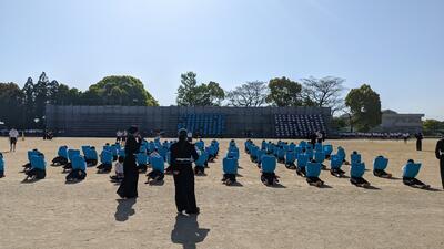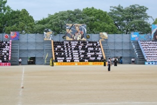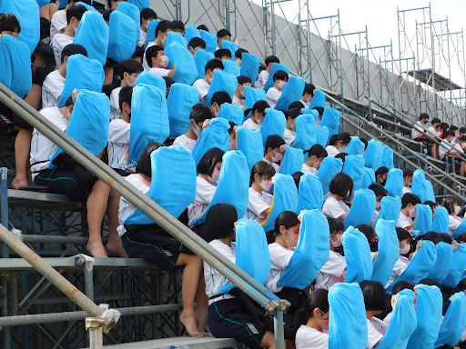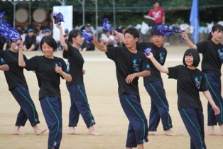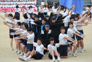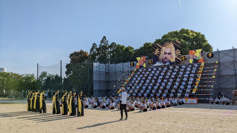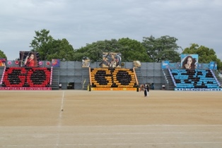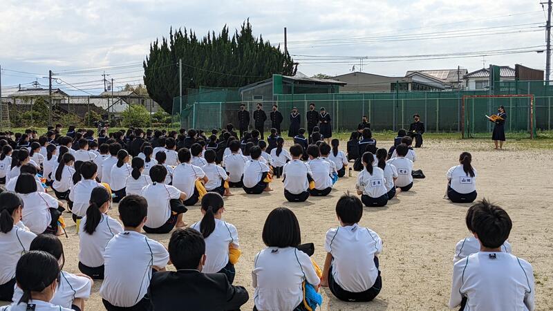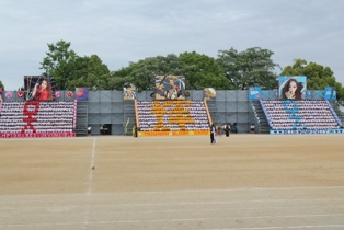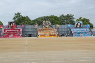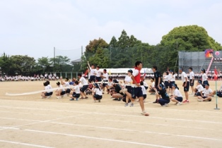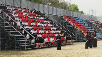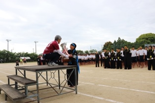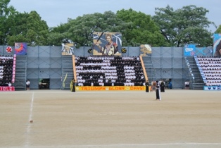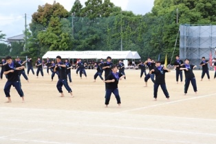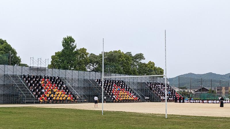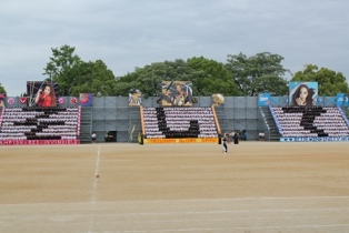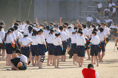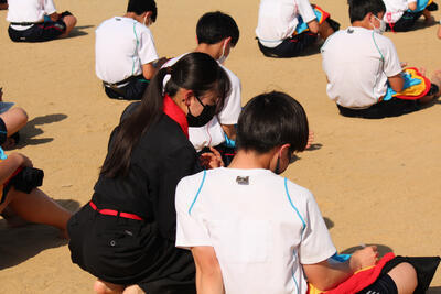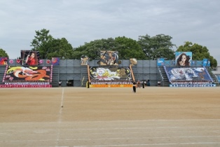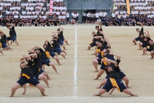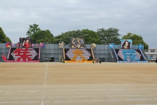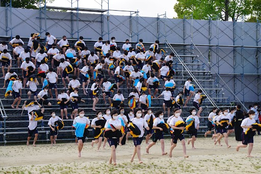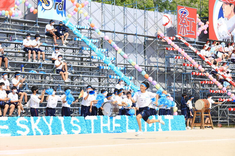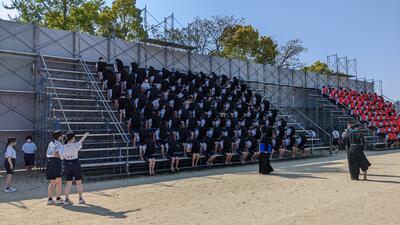 雨天のため1日順延となりましたが、体育祭当日となりました。残念ながらグラウンドの状況が悪く、短縮により各学年の集団演技、技巧競技、中高それぞれの応援合戦のみの開催で非常に悔しい結果となりました。できない競技に参加予定だった生徒たちからは残念そうな声が絶えませんでしたが、限られた時間の中で全力で楽しむことができていたようです。応援合戦ではどの団も約1ヶ月間の集大成を堂々と発表してくれました。ぎゅうぎゅうに並んだ櫓からはこれまでにないほど大きな声が聞こえ、観客の方からは何度も拍手が起こり、熱く盛り上がっていました。