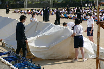 4月20日(木)、今日は体育祭練習3日目が行われました。日差しが強く、櫓の上はとても熱いようでした。以前は裸足で櫓に登っていましたが、安全面を考えて今日からシューズを履いて登ることになりました。