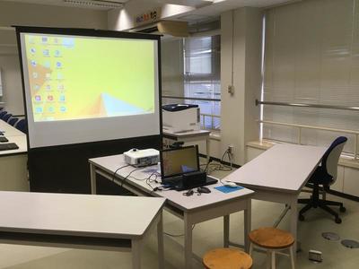 (Zoomに接続するPCをプロジェクターにつなぎ、大画面で表示。さらにマイクとスピーカーをPCに接続して準備万端。)