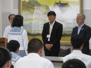 新任式では、出産でお休みになる書道の福永先生の後任として宮原公典先生、新しくALT2人配置となりイギリスから新任のアダム・デイビット・プール先生が、挨拶しました。