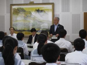 毎年、玉名高校同窓会から部活動奨励金をいただいています。今年は同窓会から岡田会長にお越しいただき、中高生徒会会長が代表して奨励金をいただきました。また、各部活動への授与式も行われ、生徒を代表してバスケットボール部主将成瀬さんが謝辞を述べました。岡田会長には在校当時の部活動の話などをしていただき、生徒達にとってよい学びの機会になりました。高校3年生への鉛筆の贈呈もありがとうございました。