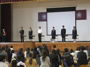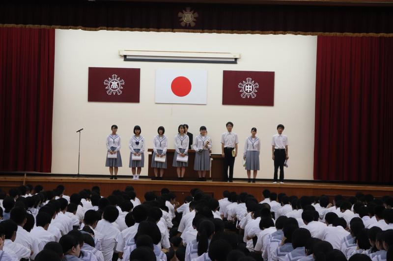 表彰式では、音楽部、箏曲部、器楽部、ギター部、書道部、中学校科学部が表彰されました。音楽部は、九州合唱コンクールで9月13日の九州大会出場、中学校の科学部は科学の甲子園ジュニア県大会で2年連続優勝し、全国大会出場を果たしました。今後の活躍もまた楽しみです。