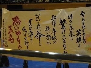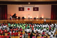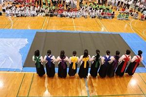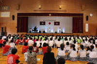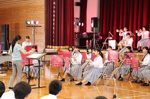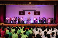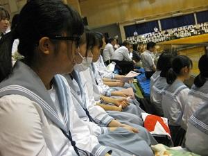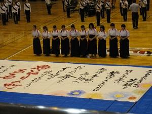 第13回となったボウハンティア音楽祭は、玉名地区での防犯意識を高めるために、地域の学校と警察の協力により行われています。「音楽祭」という名の通り、幼稚園や高校から音楽に関する発表が行われます。本校からは1年生約50名が参加し、各団体の発表を観覧しました。また、本校からは書道パフォーマンスを披露しました。普段、地域の学校と交流する機会はほとんどないので、互いを知るよい機会となりました。