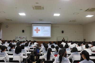 10月5日(土)玉名市民会館で高校1年生が「高校生のための熊大ワクワク連続講義」に参加しました。文理分けを間近に控えた生徒達は、現段階の希望をもとに文理に分かれ講義を聴きました。理系は、医学部医学科の伊藤隆明教授から「最強の癌・小細胞肺癌を解剖する」、文系は、グローバル教育カレッジの小池・ウルスラ・ヘレナ教授から、「Organized Humanitarianism-The Birth of the Red Cross(人道主義の組織化-赤十字の誕生)」というタイトルで、それぞれ講義をしていただきました。難しい内容もありましたが、非日常の貴重な時間を過ごすことができたと思います。生徒達には、この体験を日常生活とリンクさせ、日々の学校生活を更に充実させてもらいたいです。