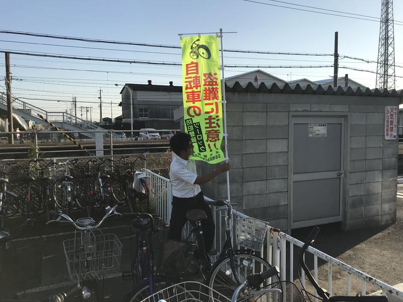 玉名駅で防犯意識向上のためののぼり旗を立てました。