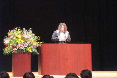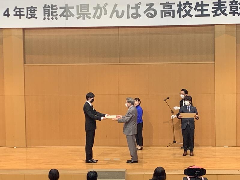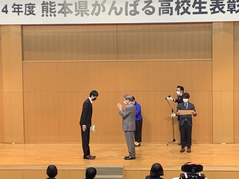 本日は、ホテル熊本テルサで熊本県がんばる高校生表彰式が開催されました。定時制4年次生の冨田君が、蒲島知事から表彰状を授与されました。知事講話の中で、「人生は無限大であり逆境の中にこそ夢があること、また夢を持ち夢に向かって一歩踏み出すこと、さらに期待値を超える120%の努力をすること」を述べられました。最後に、蒲島知事と受賞生徒全員で記念撮影が行われました。