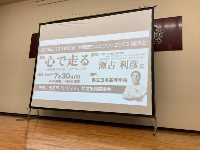 7月30日(日)玉名高校を会場に、玉名市「いだてん」地域振興協議会主催「箱根駅伝100回記念金栗四三スピリット2023講演会」が行われ、瀬古利彦さん(日本陸上競技連盟ロードランニングコミッションリーダー・DeNAアスレチックスエリートアドバイザー)が「心で走る~夢を叶えるために、今できること~」の演題で講演されました。