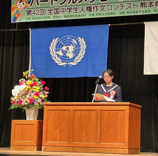 3年生の坂本さんが、全国中学生人権作文コンテスト熊本県大会で最優秀賞(熊本県人権擁護委員連合会長賞)を受賞しました。