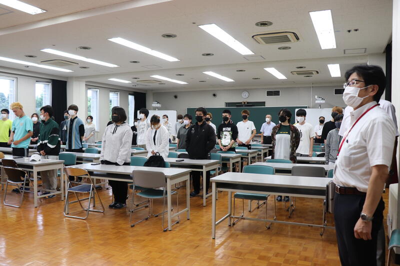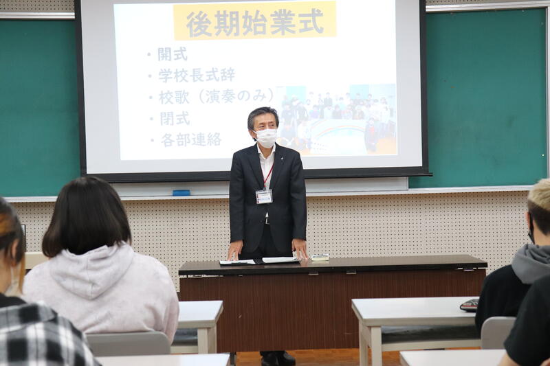 本日は、視聴覚教室で後期始業式が行われました。学校長講話では、学校に通う意義を書籍を通じて話をされました。就業している生徒が7割を超える定時制の生徒たちは、多忙な日々を送る中で、頑張って通学することの大切さについて改めて考える貴重な時間となりました。その後、校歌を全員で黙聴後、諸連絡があり終了しました。