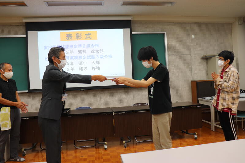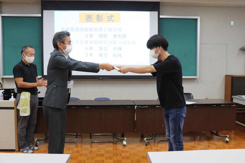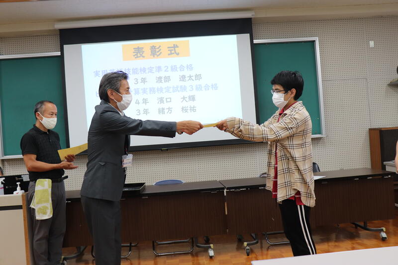 本日は、視聴覚教室で前期終業式が行われました。最初に、表彰式があり、3名の生徒が表彰を受けました。3年次生の渡部君が実用英語技能検定準2級合格、4年次生の濱口君と3年次生の緒方君がビジネス計算実務検定3級に合格しました。始業前の課外授業「玉定チャレンジ」を受け、目標を達成しました。その後の終業式の学校長講話で、世界には命懸けで毎日通学する子どもたちがおり、人生を切り開くために子供たちが頑張る様子を写真を示し話されました。その後は、各部連絡があり終了しました。