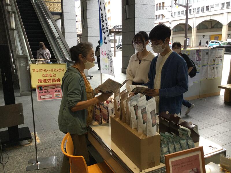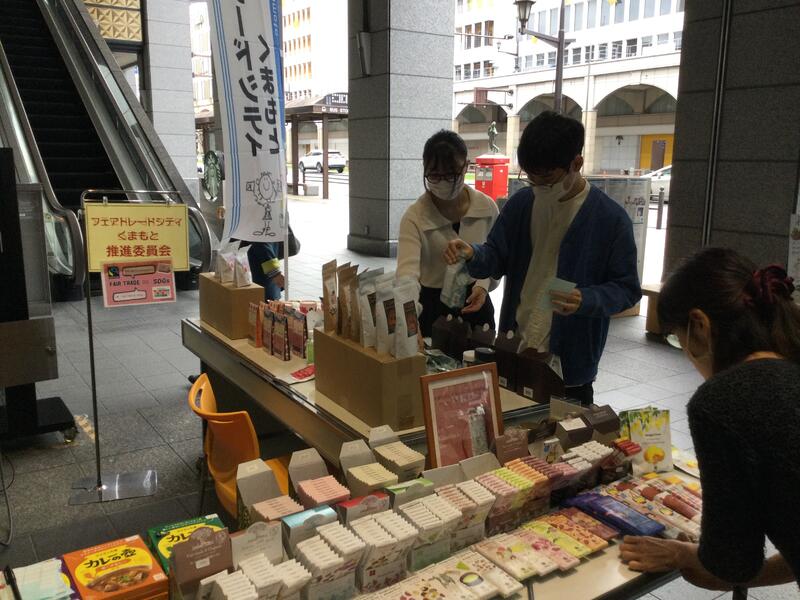 11月13日(日)にびぷれす広場(熊本市)で行われた「フェアトレードマルシェ」に、生徒会の河野さんと吉田さんが参加しました。途上国では子どもたちが安い賃金で労働力として扱われ、学校にも満足に通えずに貧しい生活を強いられている現状があります。そのような人たちが生産したものを適正な価格で販売し生活支援に繋げる取り組みが「フェアトレード」です。今回は熊本県のフェアトレードの第一人者である明石さんと一緒に上通入り口の「びぷれす広場」にて販売のお手伝いを行いました。今後もこのような活動に参加するとともに、玉高でも取り組みを実施したいと思います。