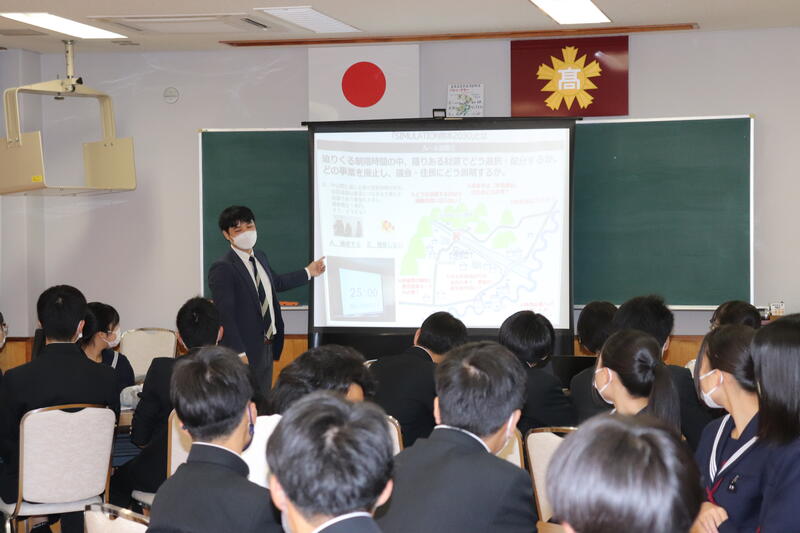 の3つの柱に沿って講話をしていただき、生徒たちは熱心にメモを取りながら話を聞いていました。