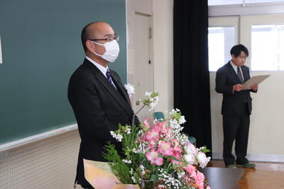 9月25日(金)始業式の前に、坂本教頭先生のご功績を西澤校長先生がご紹介され、表彰式が行われました。