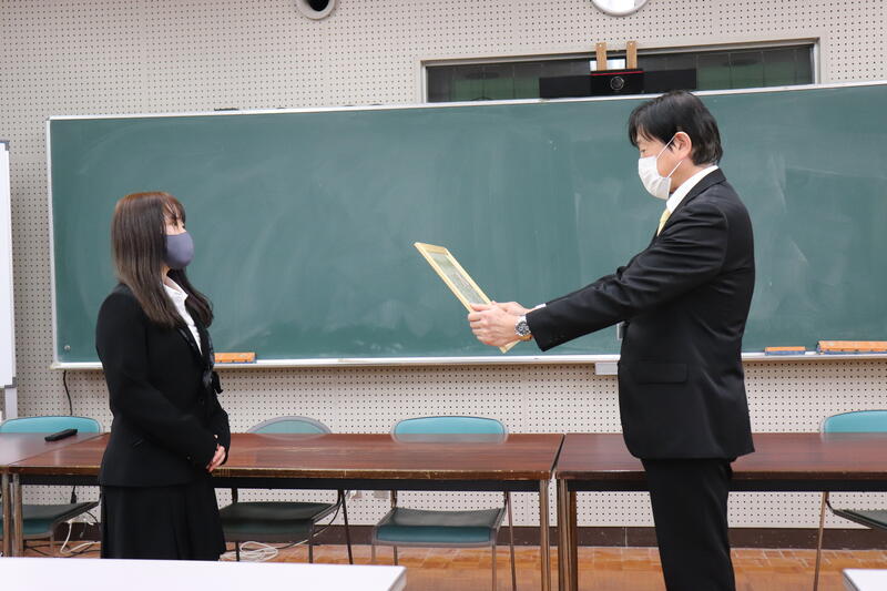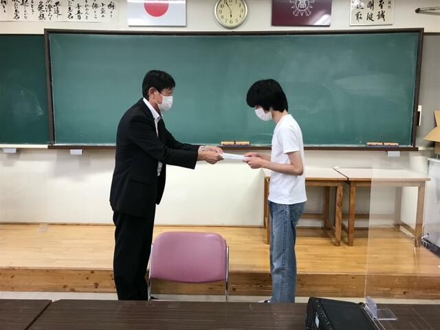 本日は、視聴覚教室で前期終業式が行われました。最初に、表彰式があり、3名の生徒が表彰を受けました。3年次生の渡部君が実用英語技能検定準2級合格、4年次生の濱口君と3年次生の緒方君がビジネス計算実務検定3級に合格しました。始業前の課外授業「玉定チャレンジ」を受け、目標を達成しました。その後の終業式の学校長講話で、世界には命懸けで毎日通学する子どもたちがおり、人生を切り開くために子供たちが頑張る様子を写真を示し話されました。その後は、各部連絡があり終了しました。